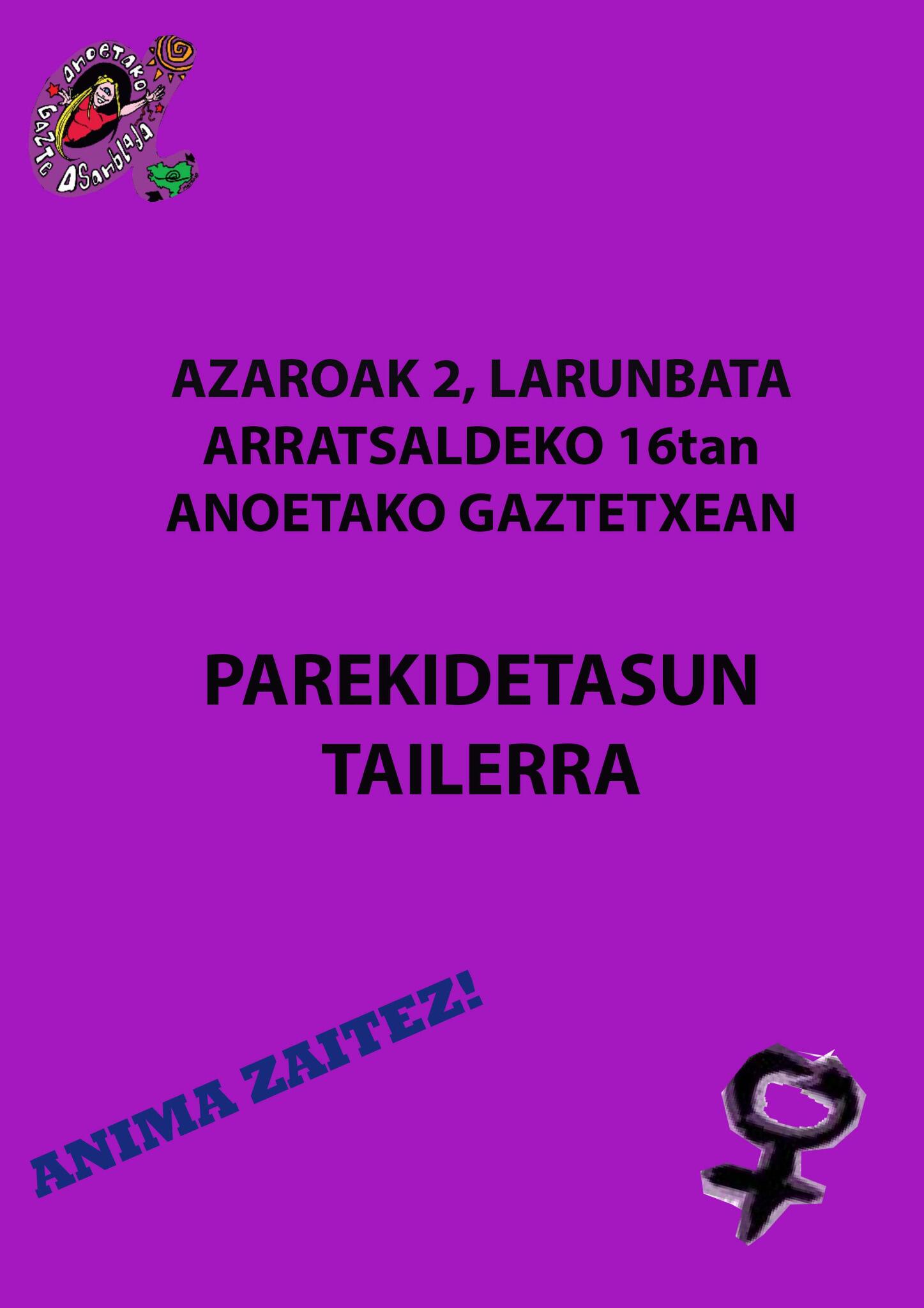 Larunbat honetan, azaroak 2, arratsaldeko 16:00tatik aurrera parekidetasun tailerra izango dugu Anoetako Gaztetxean.